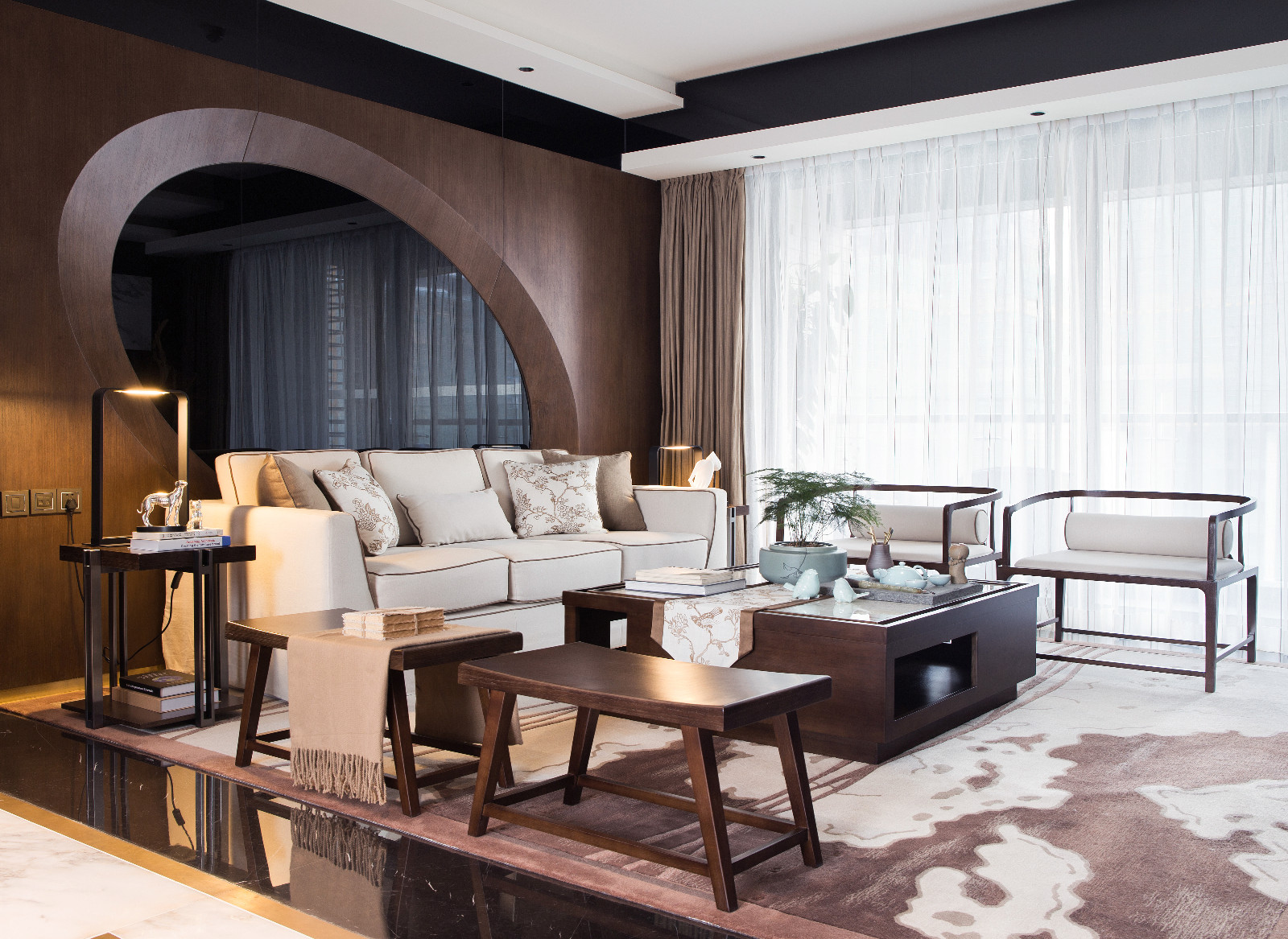 客厅中,大理石和原木桌椅以及布面沙发的组合古典中凸显时尚,质朴中彰显高贵,黑、白、木以及玉兰色的色彩组合,对比强烈,夺目而不刺眼,体现主人雅而不凡的审美。