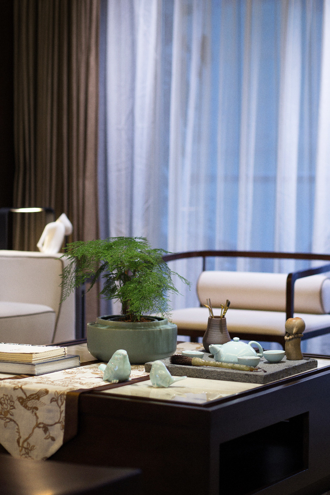 客厅中,大理石和原木桌椅以及布面沙发的组合古典中凸显时尚,质朴中彰显高贵,黑、白、木以及玉兰色的色彩组合,对比强烈,夺目而不刺眼,体现主人雅而不凡的审美。